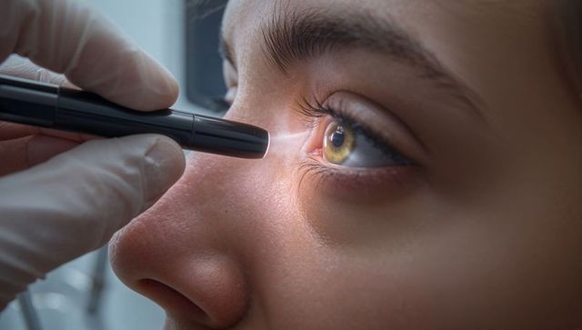 Gloved clinician examining right hazel eye with penlight, illuminating pupil closeup