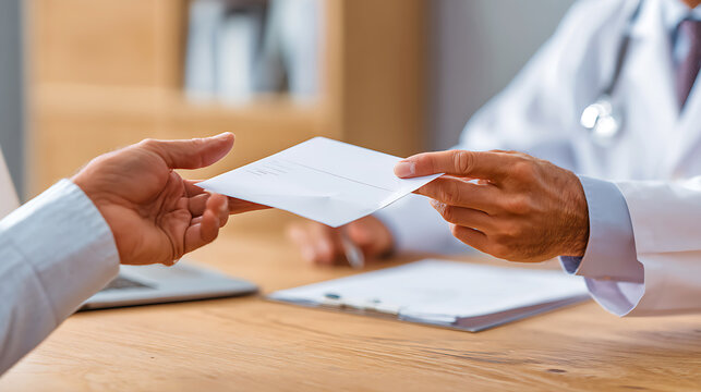 A professional physician in a white medical uniform talks to discuss results or symptoms and gives a recommendation to a male patient and signs a medical paper at an appointment visit in the clinic.