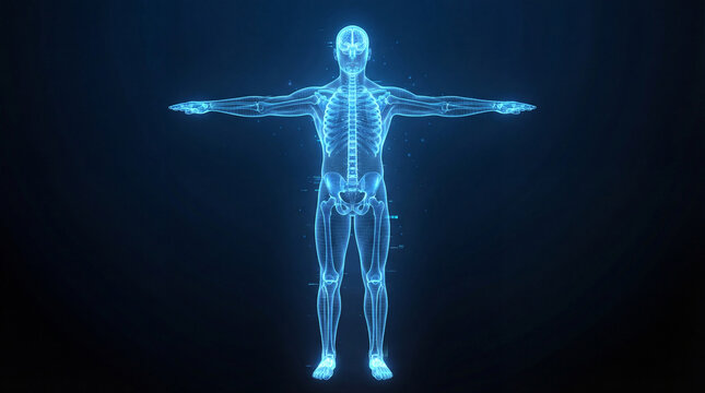 Human body hologram with visible skeleton futuristic medical technology blue glowing 3D rendering