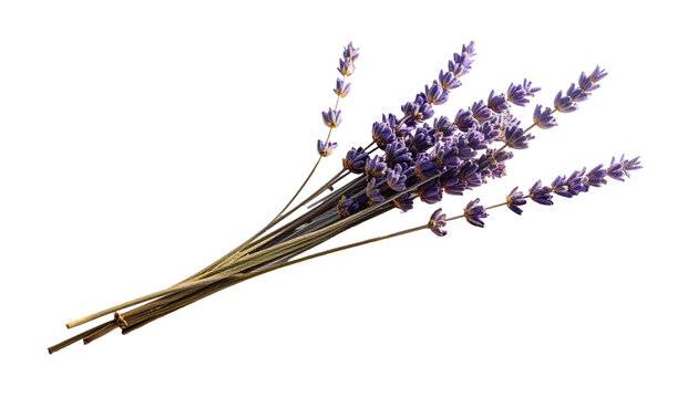 Isolated dried lavender twig appears as a delicate botanical element, featuring natural texture, gentle soft shadows, and clean white background, suitable for design, presentation, decoration, or calm
