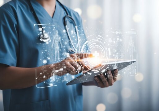 Healthcare professional analyzing data with digital technology overlay