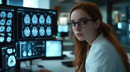 A focused female medical professional analyzes complex brain scans on multiple digital monitors in a modern healthcare setting