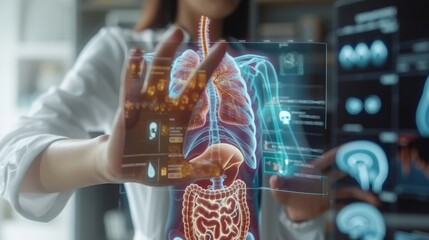Woman doctor using futuristic medical interface for anatomy analysis. Innovative healthcare technology and research concept for diagnosis and education.