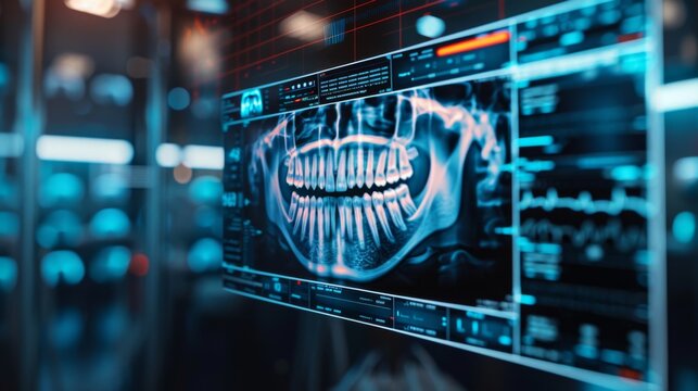 Detailed x ray of human teeth is presented on a screen in a modern dental clinic, showcasing advanced imaging technology and interactive digital tools for diagnostics and analysis.