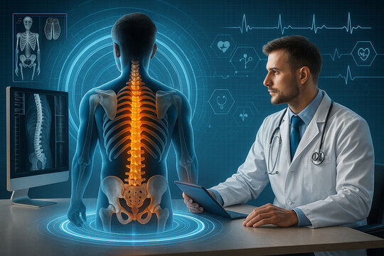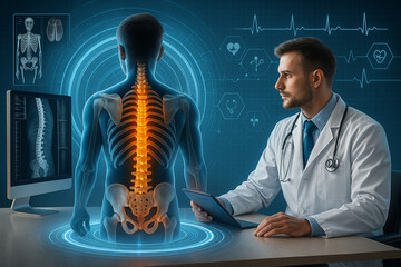 AI generated futuristic medical scene showing doctor in white coat with stethoscope studying glowing orange digital spine pelvis with X ray and health interface symbolizing innovation and diagnosis