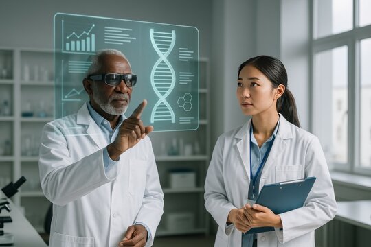 Diverse scientists in lab coats analyze holographic DNA and data charts on a modern digital display