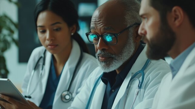 Doctors and healthcare professionals are working together, analyzing medical data on a tablet, discussing patient diagnosis and treatment plans in a modern hospital setting