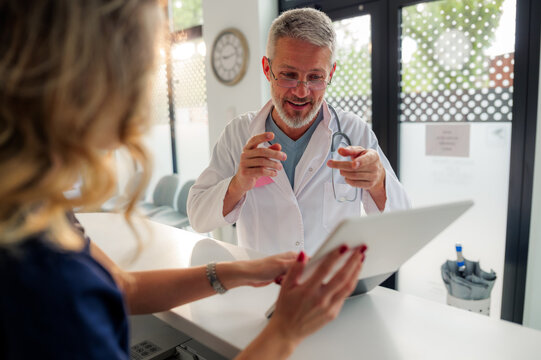 Senior doctor explaining medical information on tablet to nurse at hospital reception desk, discussing patient data and treatment plans in modern healthcare setting