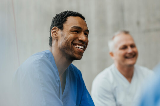 Happy male healthcare worker enjoying with medical team in hospital