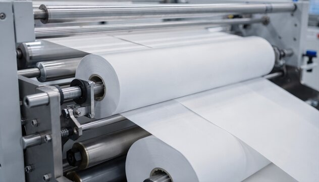 Medium shot of narrow medical rolls being precisely slit from large parent rolls highlighting clean edges and specialized equipment for sterile applications.