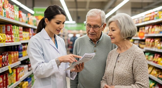 Pharmacist Assisting Senior Couple with Medication Information and Prescription Details in Supermarket Aisle