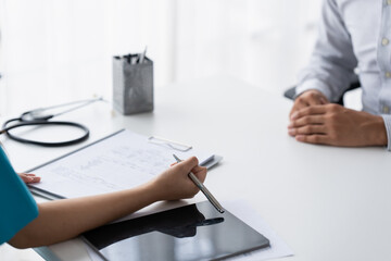 A professional physician in a white medical uniform talks to discuss results or symptoms and gives a recommendation to a male patient and signs a medical paper at an appointment visit in the clinic.