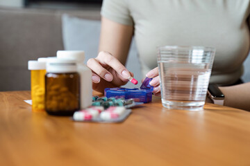 Healthcare at Home: Woman Organizing Pills with Medication Bottles and Water Glass on Wooden Table for Daily Health Management