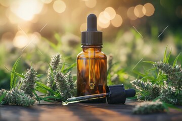 Brown Glass Bottle with Hemp Leaves and Oil Extracts in Natural Still Life Composition