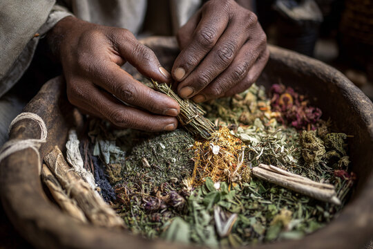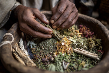 A close-up of a traditional mountain healer's hands mixing natural herbs and plants, emphasizing indigenous medicinal practices and ancient knowledge.