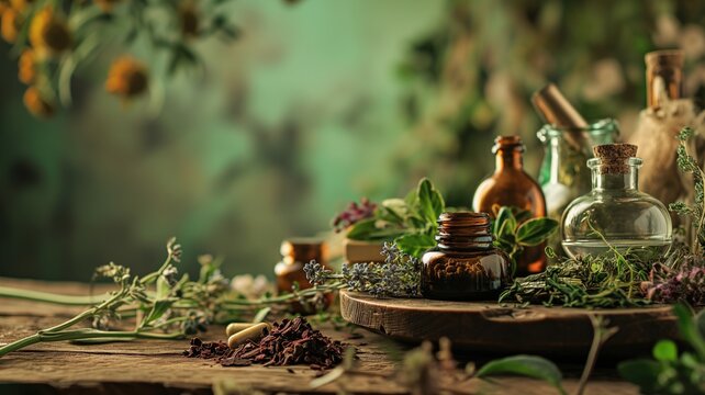 Herbal medicine preparation with bottles and fresh herbs