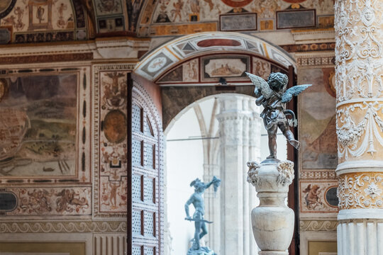 Sculpture of cupid with dolphin in the inside contryyard of a Palazzo Vecchio palace in the old Florence town, Italy.
