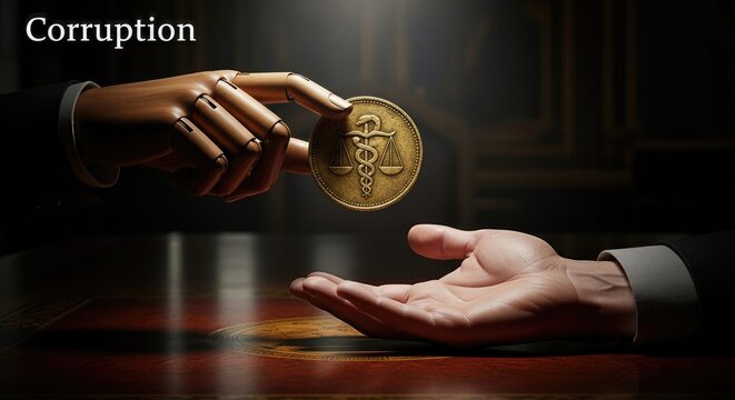 Concealed transaction, legal emblem exchanged between hands, symbolizing illicit influence and systemic corruption, obscuring fairness and integrity in dealings.