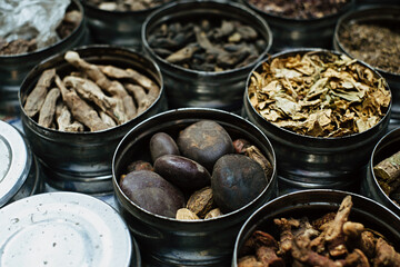 Medicine Bottles and Pills on Reflective Surface With Grey Backg