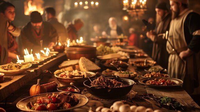 A medieval feast with traditional foods, music, and celebration creates an immersive, lively atmosphere.