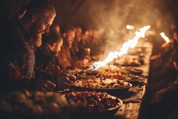 Festive gathering with traditional food and fire at a medieval banquet in a dimly lit hall