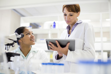 Scientists using digital tablet and microscope in laboratory