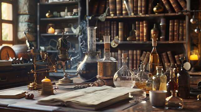 Vintage alchemist laboratory with unique scrolls and manuscripts