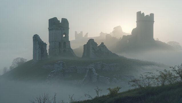 Misty medieval castle ruins with ethereal mood on a hilltop