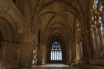 Ornate gothic stone window frame at end of a long hall with pools of light