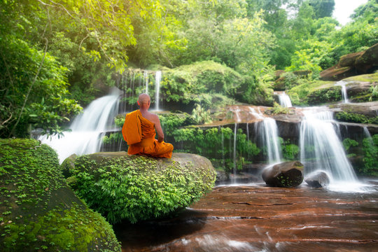 buddhist monk in meditation pose  with zen symbol on the backgro
