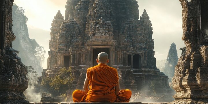 Indian sadhu monk meditating in temple. Religious prayer man. Person sit in lotus pose and pray. Zen yoga practice. Peaceful beauty. Spiritual asana.
