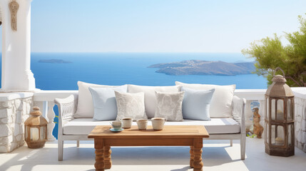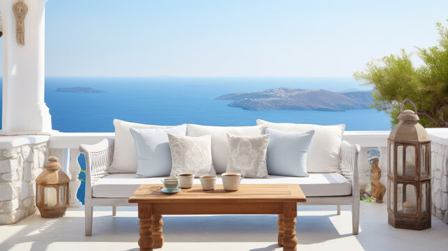 Rustic lounge sofa and coffee table on white stone terrace. Traditional mediterranean architecture. Summer background with sea view. Generative AI