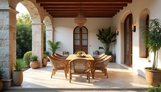 Serene mediterranean oasis with sunlit archways and modern decor for interior inspiration