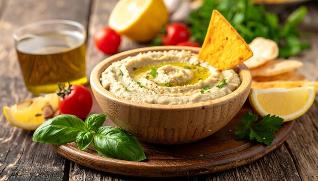 Hummus in wooden bowl, garnished, with lemon, tomato, basil, and olive oil on a wooden tray