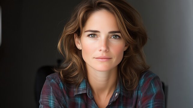 Close-up portrait of a woman with a serious expression.  She has medium-length brown hair, and light complexion.  She wears a plaid shirt.  Dark background