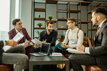 young caucasian experienced men in tuxedo gathered at meeting for solving problems connected with business projects, discussing deadlines and sharing opinions with each other