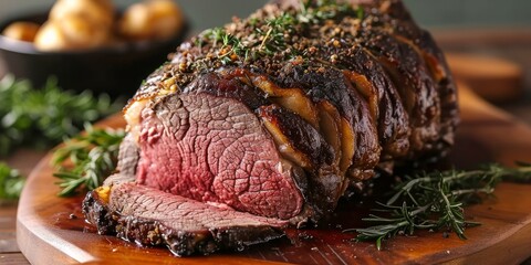 Juicy grilled rib eye steak sliced, served with roasted potatoes and rosemary sprig. Meat is medium rare, tender with charred crust. Perfect for steakhouse menus, gourmet food blogs or recipe content.