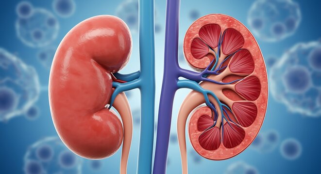 An anatomical illustration displays healthy human kidneys, one intact and the other revealing its detailed internal structure.