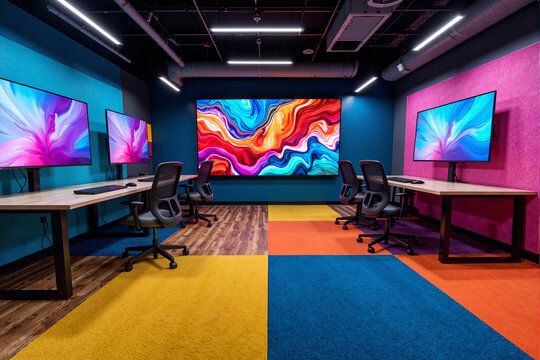 State-of-the-art corporate meeting room featuring multiple large digital screens displaying colorful abstract visuals, modern furniture, and vibrant carpet for presentations or collaboration