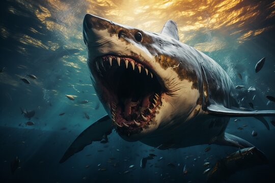 Majestic ancient megalodon shark surrounded by a school of smaller fish in the depths of the ocean