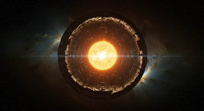 Concept art of a Dyson Sphere seen from the front, capturing a star at its core. The colossal megastructure emphasizes the scale of futuristic space engineering, with glowing stellar light radiating