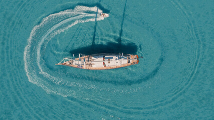 View from above, stunning aerial view of some luxury yachts sailing on a blue water.Sardinia, Italy.