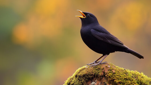 A blackbird stands on a moss-covered rock, its beak open, as if singing its melodic song against the blurred autumn landscape