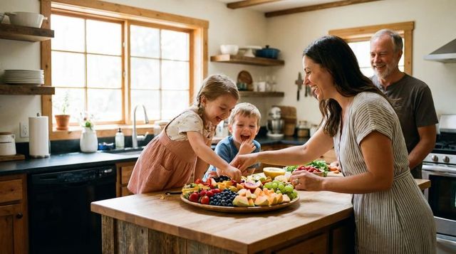 Family gathering around farmhouse kitchen island arranging colorful fruit platter