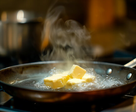 Butter melting in pan with steam, cooking process.