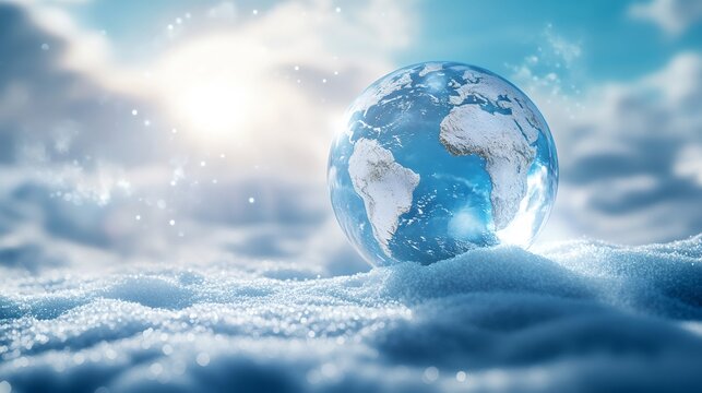 A globe on melting ice symbolizes global warming and climate change urgency. The image portrays Earth with icy regions, emphasizing the need for immediate action.