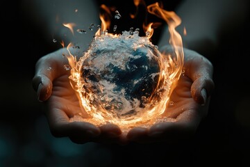 Human hands cradling a burning and melting representation of the planet