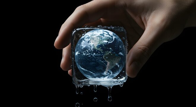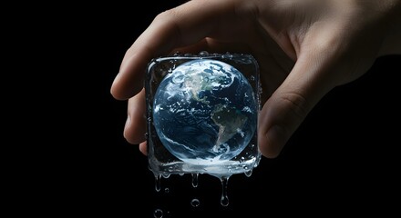 Hand holding a melting ice cube with a globe inside against a dark black studio background scene view