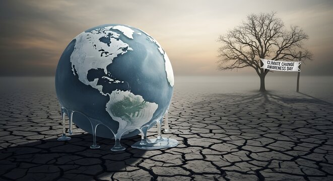 Melting Globe: A poignant visual metaphor depicts the Earth, in a globe form, melting into a puddle. Expressing concern about climate change.
