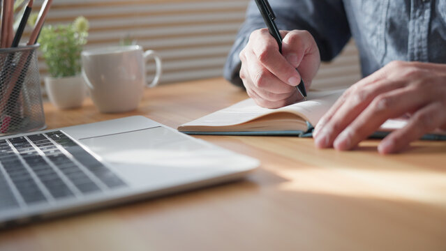 Close up of man working on laptop computer and hand with a pen writing on notebook on office table